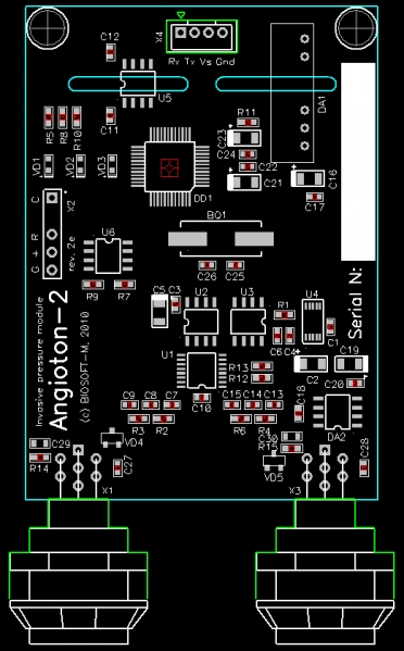 2-канальный OEM-модуль Ангиотон (rev. 2e) со специальными разъемами LEMO типа PKB.M0.7GLV, предназначенный для установки в моноблок Ангиодин-ПМД фирмы БИОСС.