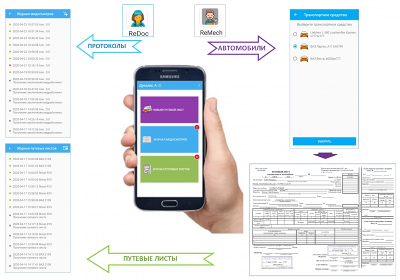Путевой лист водитель готовит сам при условии, что получил допуск к работе по результатам медосмотра. "MEDCheckup" контролирует прохождение водителем медосмотра и наличие соответствующей категории водительских прав. Для выбора транспортного средства "MEDCheckup" автоматически загружает водителю список прошедших техосмотр автомобилей из мобильного приложения механика - "ReMech".