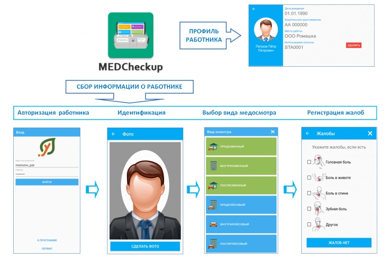 При использовании комплекса "СТРАЖ" приложение "MEDCheckup" предоставляет каждому работнику возможность пройти медосмотр из личного кабинета после фотографирования, выбора вид осмотра и указания жалоб на состояние здоровья.