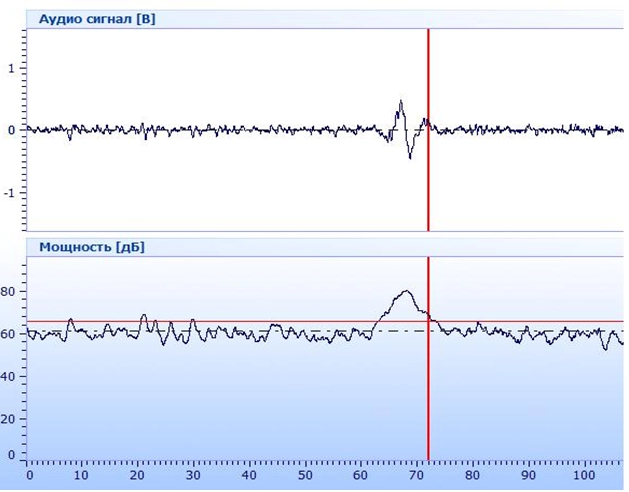 Для исследования эмболий с указанными характеристиками алгоритм автодетекции должен иметь высокую чувствительность. Учитывая данное обстоятельство и международные рекомендации [18, 19], были выбраны следующие параметры его настройки: порог детекции МЭС — 5 дБ, порог режекции - 6,5 дБ, порог длительности — 4 мс, нижний nopor частоты детекции — 200 Гц, верхний порог — 1600 Гц, Дополнительно включался режим трассировки всех сигналов высокой интенсивности, что позволяло значительно повысить информативность процесса исследования интракраниальной эмболизации.