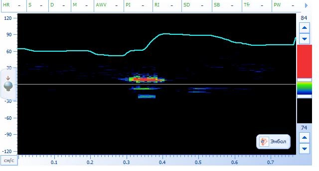 В целях эксперимента для обработки МЭС низкой интенсивности, которые теоретически могли регистрироваться у пациентов с ПИ ВСА, мы имели возможность коррекции параметров алгоритма автоматической детекции эмболий.