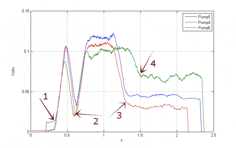 Ток запуска насоса №4 меньше, чем у остальных насосов (1.0 у №4, 1.15 у №5, 6), но в установившемся режиме потребляемый ток больше (0.7 у №4, 0.4 у №5, 6). Т.е. насосы №4 и №5 отличаются друг от друга. Характеристики насосов №5 и №6 отличаются незначительно.