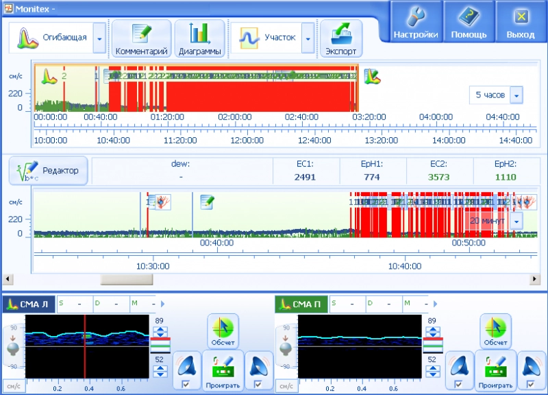 - Расчет и оперативное отображение мощности эмболического сигнала и времени его регистрации.