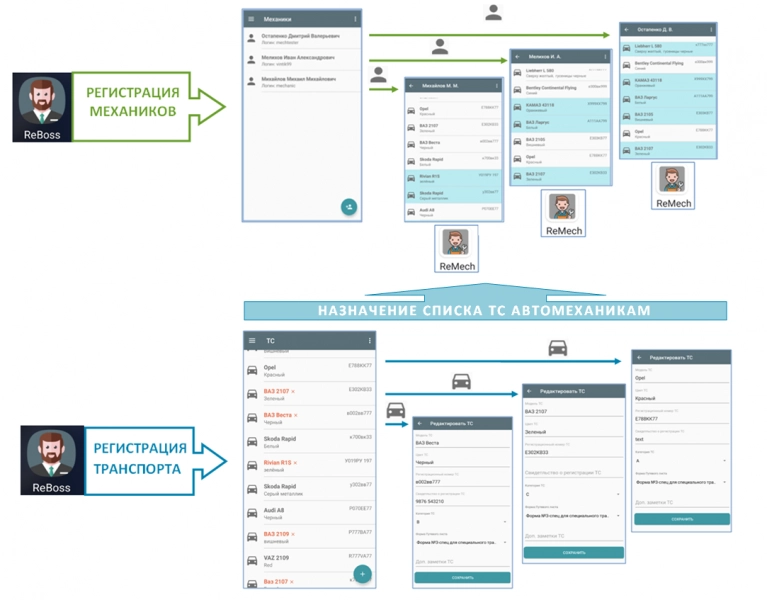 Механики и транспортные средства регистрируются руководителем предприятия в приложении "ReBoss". Каждому механику используя "ReBoss" руководитель назначает список автомобилей для техосмотра, который запоминается и передаётся в мобильное приложение механика "ReMech". Корректировка списка может выполняться руководителем по ситуации.
