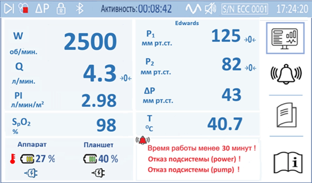 - в правой части размещены управляющие элементы для отображения на экране тревожных сообщений, журнала зарегистрированных параметров и событий, просмотра документов по эксплуатации изделия и видеозаписей по его применению в клинической практике;