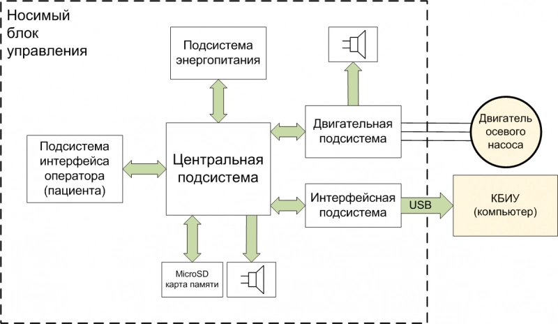 Задача создания носимого АВК на базе ОН подразделяется на две составляющих: разработка собственно имплантируемого насоса и разработка носимого блока управления (НБУ) с системой энергопитания, которая также включает в себя стационарный компьютерный блок информации и управления. В данной статье приводится описание конструкции НБУ, его функциональных характеристик, системы энергопитания и компьютерного блока информации и управления. В штатном режиме эксплуатации НБУ должен поддерживать заданную оператором или пациентом скорость вращения ротора имплантируемого ОН.