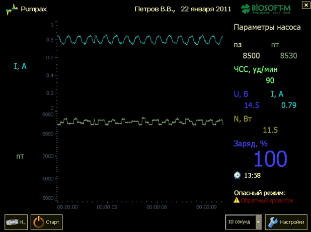 - Мониторинг функциональных характеристик СВК в течение интенсивного и рекуперативного лечения пациента, а также для его периодического контроля в ходе выполнения клинических или амбулаторных процедур. На рис. 3 показано окно мониторинга, отображающее графики мгновенных текущих значений потребляемого тока и числа оборотов двигателя ОН, цифровую индикацию рабочих параметров ОН и системы энергопитания, диагностические сообщения;