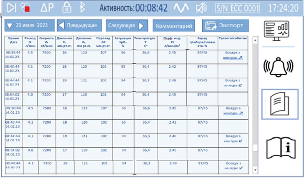 Запись в журнал любого события включает синхронизированную с событием запись текущих значений параметров перфузии и состояния оборудования.