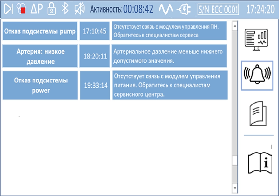 2. Реализация экрана тревог позволяет сохранять полную историю возможных нарушений условий эксплуатации ЭКМО Ex-Stream на протяжении всего сеанса перфузии.