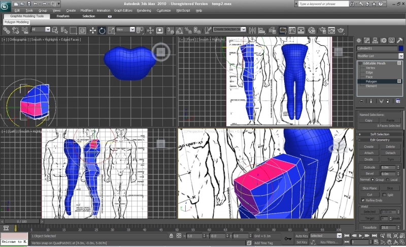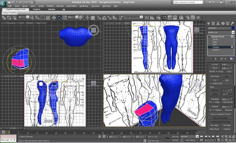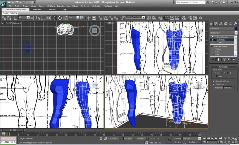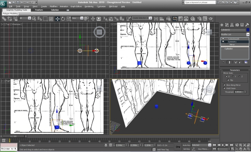 Первое дело в моделировании объектов это создание виртуальной студии. Создаем два объекта QuadPatch, располагаем их перпендикулярно друг другу и назначаем им соответсвующий материал с подготовленным изображением. Для создания тела мы будем использовать шестиугольный цилиндр, создаем его в окне top и располагаем его в районе голени. Преобразуем наш цилиндр в Editable Mesh. Неплохо будет сразу видеть как выглядит наша модель в результате. Для этого создаем "копию" (Reference) нашей модели, оттащив чуть в сторону. Применяем к ней модификатор Symmerty и TurboSmooth.