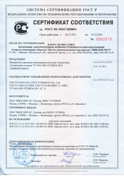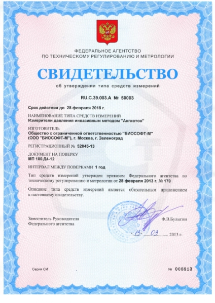 Прибор сертифицирован, имеет регистрационное удостоверение и свидетельство об утверждении типа средств измерений.