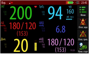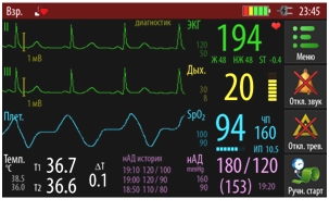 Канал дыхания реализует импедансный метод измерения частоты дыхания в диапазоне 0...120 вдох/выдох с погрешностью ±2 вдох/мин или ±2%