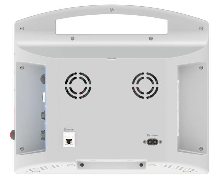 На левой боковой панели Комплекса размещены: кнопка включения/выключения электропитания, разъём электронного датчика температуры, разъём подключения трубки алкотестера со встроенным инфракрасным измерителем температуры, разъём подключения принтера и кнопка экстренного сброса давления в манжете тонометра