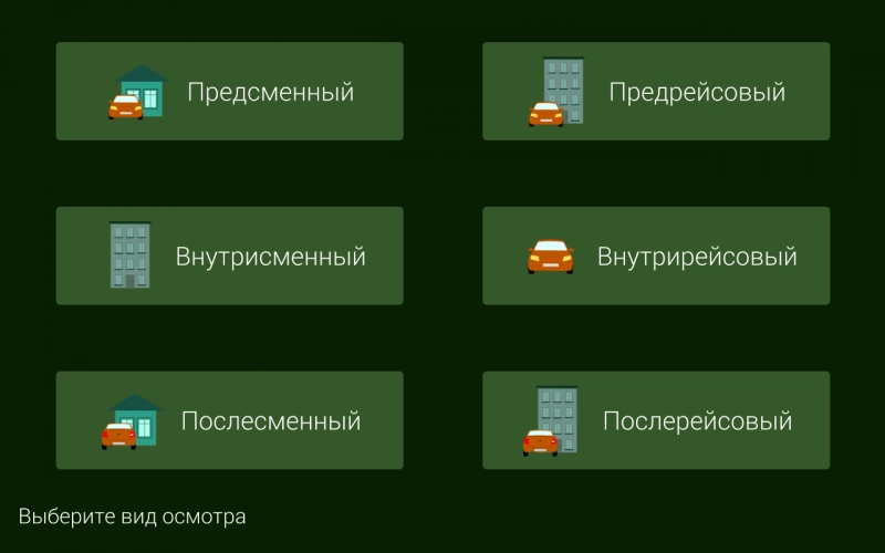 Третий шаг: выбирается вид медицинского осмотра: предрейсовый, предсменный, послерейсовый, послесменный, внутрирейсовый, внутрисменный. Для выбора необходимо прикоснуться к названию медосмотра на экране монитора.