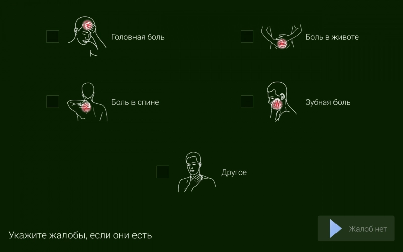 Четвёртый шаг: указываются жалобы на состояние здоровья. Для указания необходимо прикоснуться к названию одной или нескольких жалоб, указанных на экране монитора.