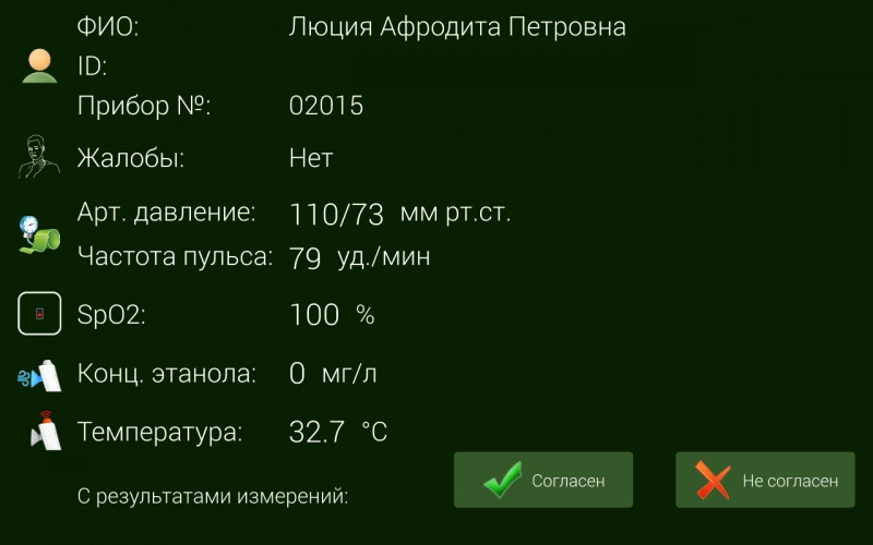 Девятый шаг: согласие с результатами, полученными при прохождения медицинского осмотра в автоматизированном режиме. Работнику отображаются результаты измерения параметров его состояния, которые он должен подтвердить. После чего они будут отправлены медицинскому работнику для анализа и подготовки заключения. В противном случае медосмотр начинается заново.