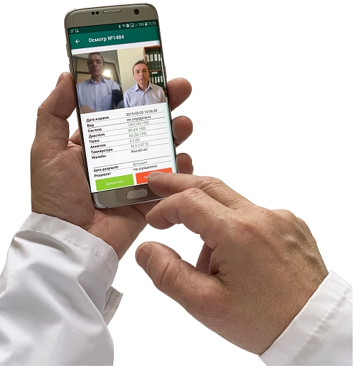 Система автоматически регистрирует результаты обследования, включая аудио- и видеозапись процедуры осмотра с последующей трансляцией полученных результатом на мобильные средства связи медицинским работникам по сети Интернет для принятия решения о допуске сотрудника предприятия к работе.