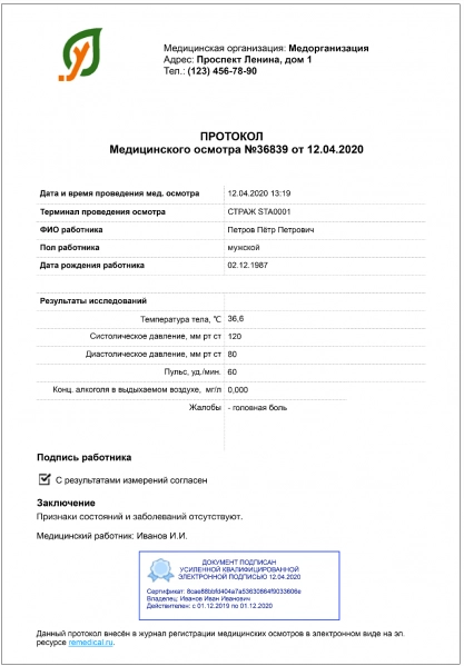 Одиннадцатый шаг: на основании принятого медработником решения формируется протокол медицинского заключения, который подписывается усиленной квалифицированной электронной подписью врача и передаётся на смартфон работника предприятия в формате PDF (рисунок слева).