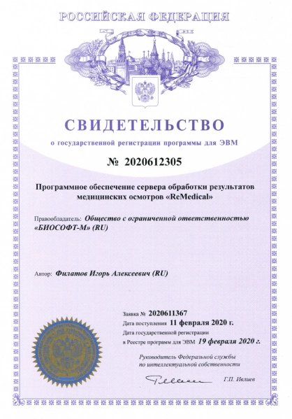 Программное обеспечение (ПО) Комплекса реализует полный цикл автоматизации всех операций медицинского осмотра, включая ведение электронного документооборота, онлайн коммуникацию в едином информационном пространстве всех участников медосмотра (работник предприятия, медицинских специалистов механика и администрации предприятия), трансляцию данных на сервер, обработку статистики заболеваний, ведение журналов регистрации осмотров и подготовку выписок из них, документирование, архивирование и распечатку протоколов медицинских заключений и путевых листов.