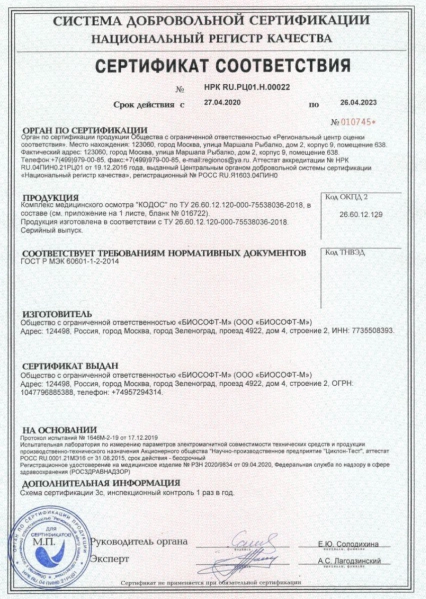 Разработанный и производимый ООО "БИОСОФТ-М" медицинский комплекс "КОДОС" предназначен для автоматизации проведения предрейсовых, предсменных и послерейсовых, послесменных медицинских осмотров в отношении отдельных категорий работников в случаях, установленным Трудовым кодексом РФ и другими федеральными законами.