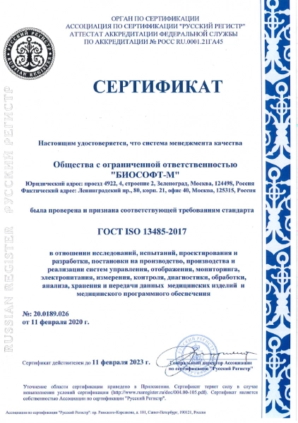 Система менеджмента качества, действующая на предприятии в отношении исследований, разработок, производства и обслуживания медицинских изделий сертифицирована на соответствие требованиям ГОСТ Р ИСО 9001-2015 и ГОСТ ISO 13485-2017