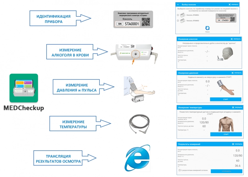Реализованная на базе созданного комплекса технология дистанционных медосмотров не противоречит существующим требованиям Федеральных законов к организации и проведению медосмотров, а дополняет и развивает их практику высокотехнологичными решениями, основанными на использовании мобильных устройств связи с установленным комплектом мобильных приложений, что позволяет повысить оперативность и качество предрейсовых, предсменных и послерейсовых,послесменных медосмотров при снижении затрат на их проведение.