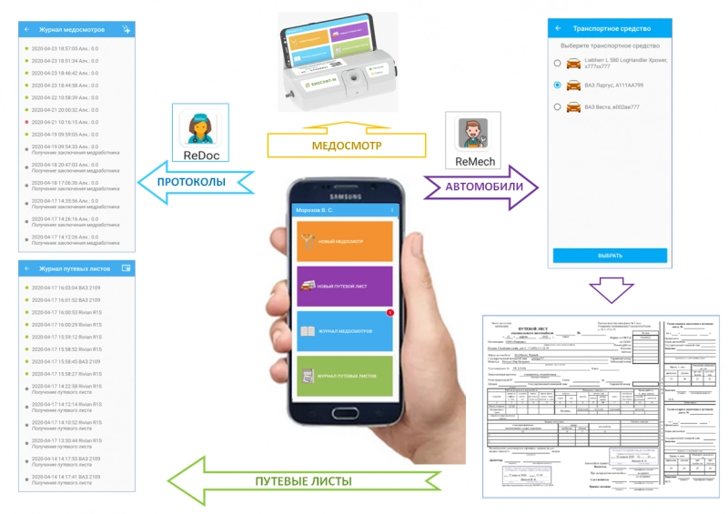 Все операции управления комплексом, обмена данными, обработки и отображения результатов медосмотров, подготовки путевых листов и протоколов медицинских заключений, ведения электронных журналов и выписок из них выполняются с использованием мобильных устройств: смартфонов /планшетов/нетбуков и системы мобильных приложений: водителя/работника "MEDCheckup", медицинского специалиста "ReDoc", руководителя предприятия "ReBoss", механика "ReMech".