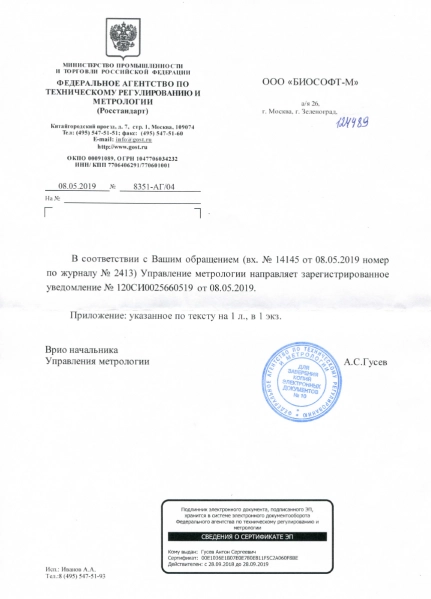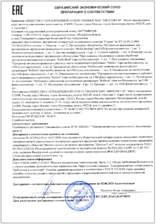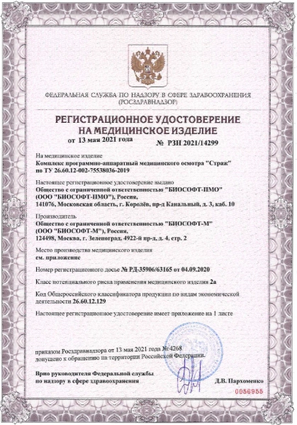 Комплекс программно-аппаратный медицинского осмотра «Страж» по ТУ 26.60.12-002-75538036-2019 зарегистрирован Федеральной службой по надзору в сфере здравоохранения 13 мая 2021 г. № РЗН 2021/4299.