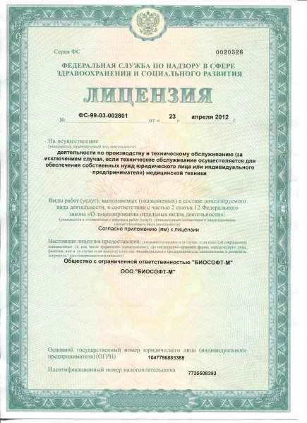 Изготовление "Страж" осуществляется на производственной базе ООО "БИСОФТ-М", лицензированной Росздравнадзором на производство и техническое обслуживание медицинских изделий