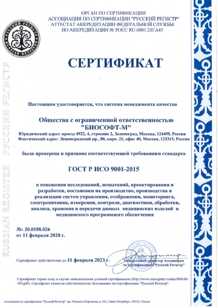 Система менеджмента качества, действующая на предприятии в отношении исследований, разработок, производства и обслуживания медицинских изделий сертифицирована на соответствие требованиям ГОСТ Р ИСО 9001-2015 и ГОСТ ISO 13485-2017